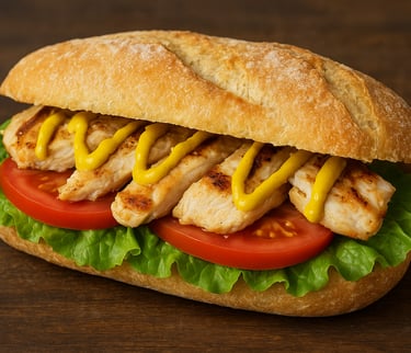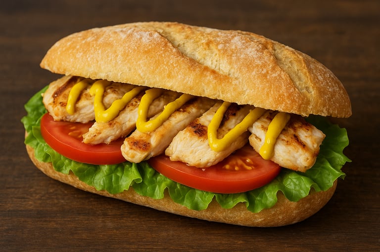 Sandwich de filete de pollo con lechuga , tomate y crema de mostaza