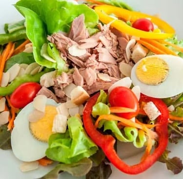 Ensalada de lechuga con atún, huevo, aceitunas, zanahoria, tomate y cebolla.