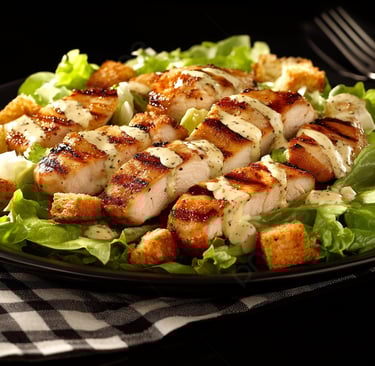 Ensalada de lechuga con pollo empanado, cebolla, tomate, aceitunas, queso loncha, queso rallado, picatostes y salsa césar